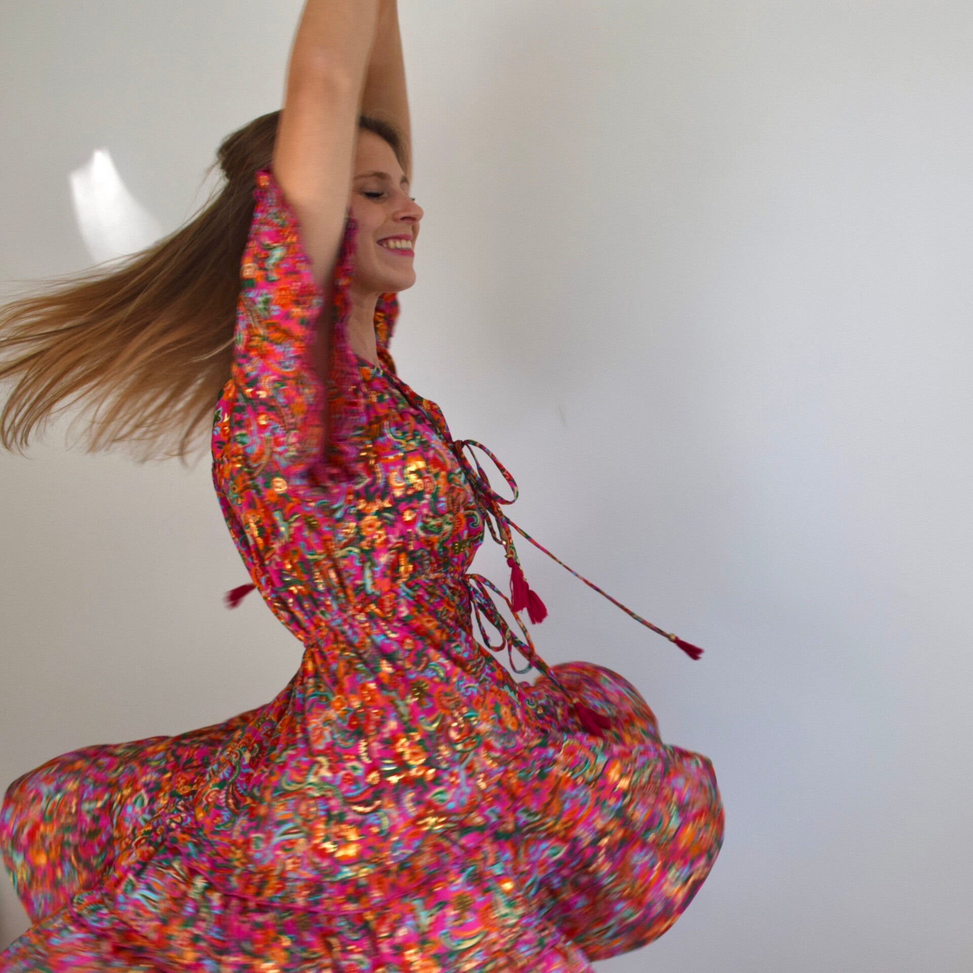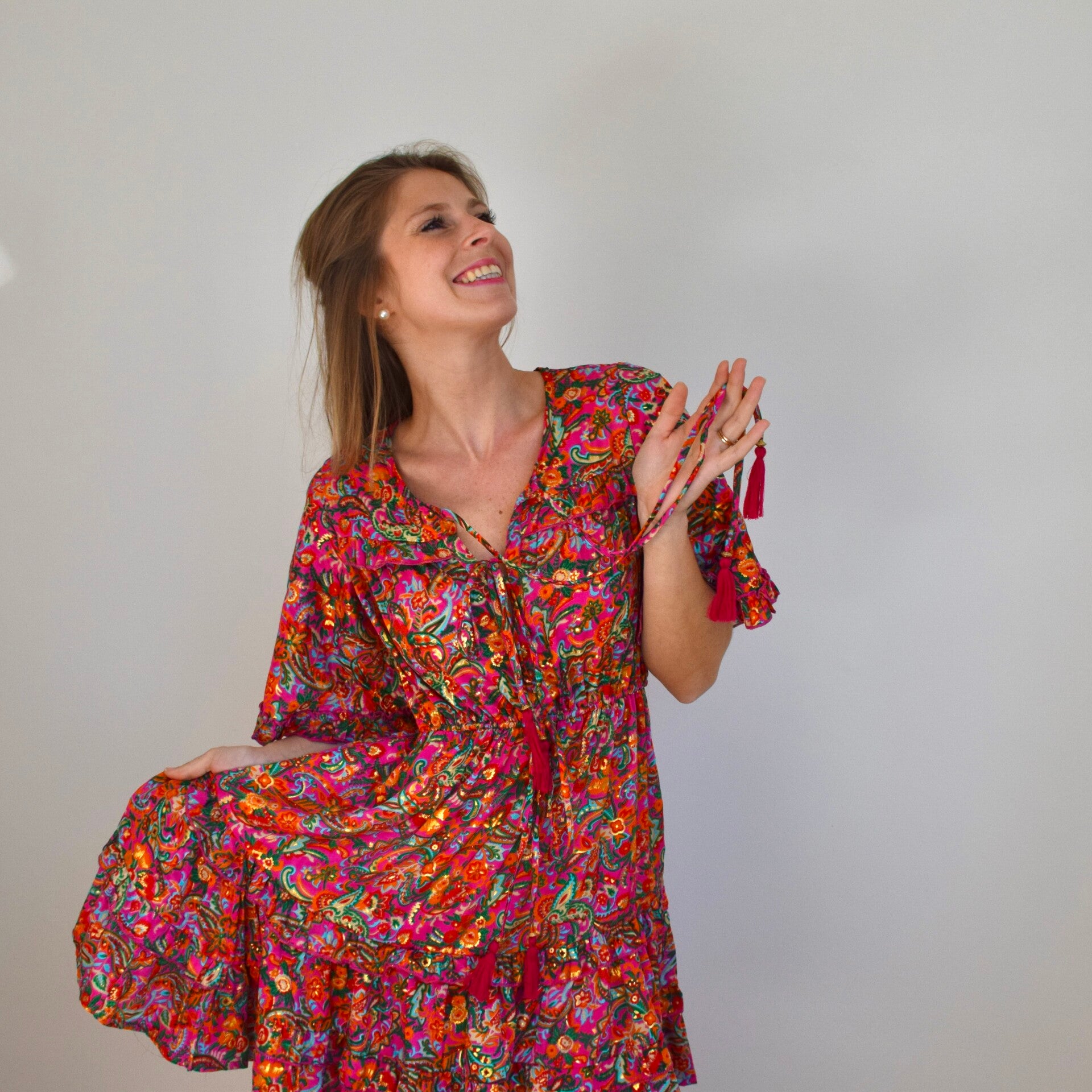 Dit prachtige jurkje kan dienen als een chique avondkleedje of als mooi strandjurkje. Het tailleert mooi, heeft leuke details en een luchtig stofje. Dit jurkje heeft vlindermouwtjes ipv lange.