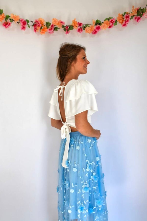 Een witte blouse in cropvorm die zowel met een broek als rok gecombineerd kan worden. De mooie V-hals, nog mooiere open rug en leuke mouwen zorgen dat hij een ware must have is!