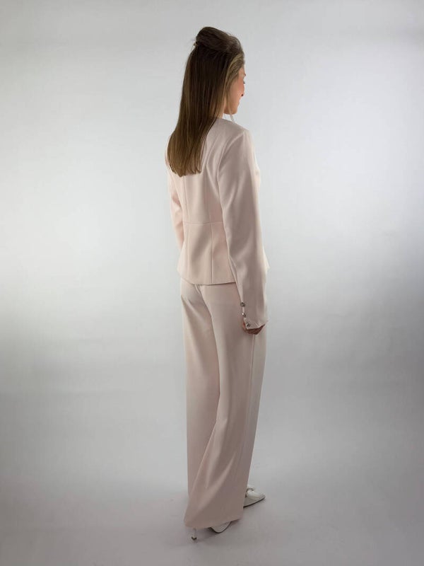 De Oprah set is een uiterst stijlvol broekpak in een zachtroze kleur, afgewerkt met mooie zilveren knopen. Zowel de broek als blazer worden mooi getailleerd.