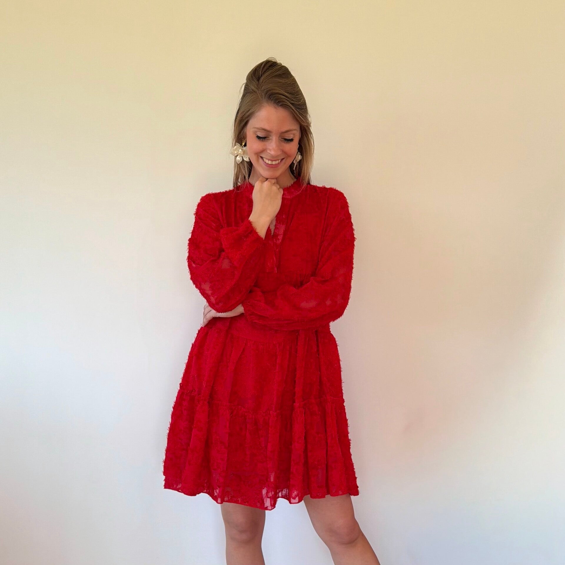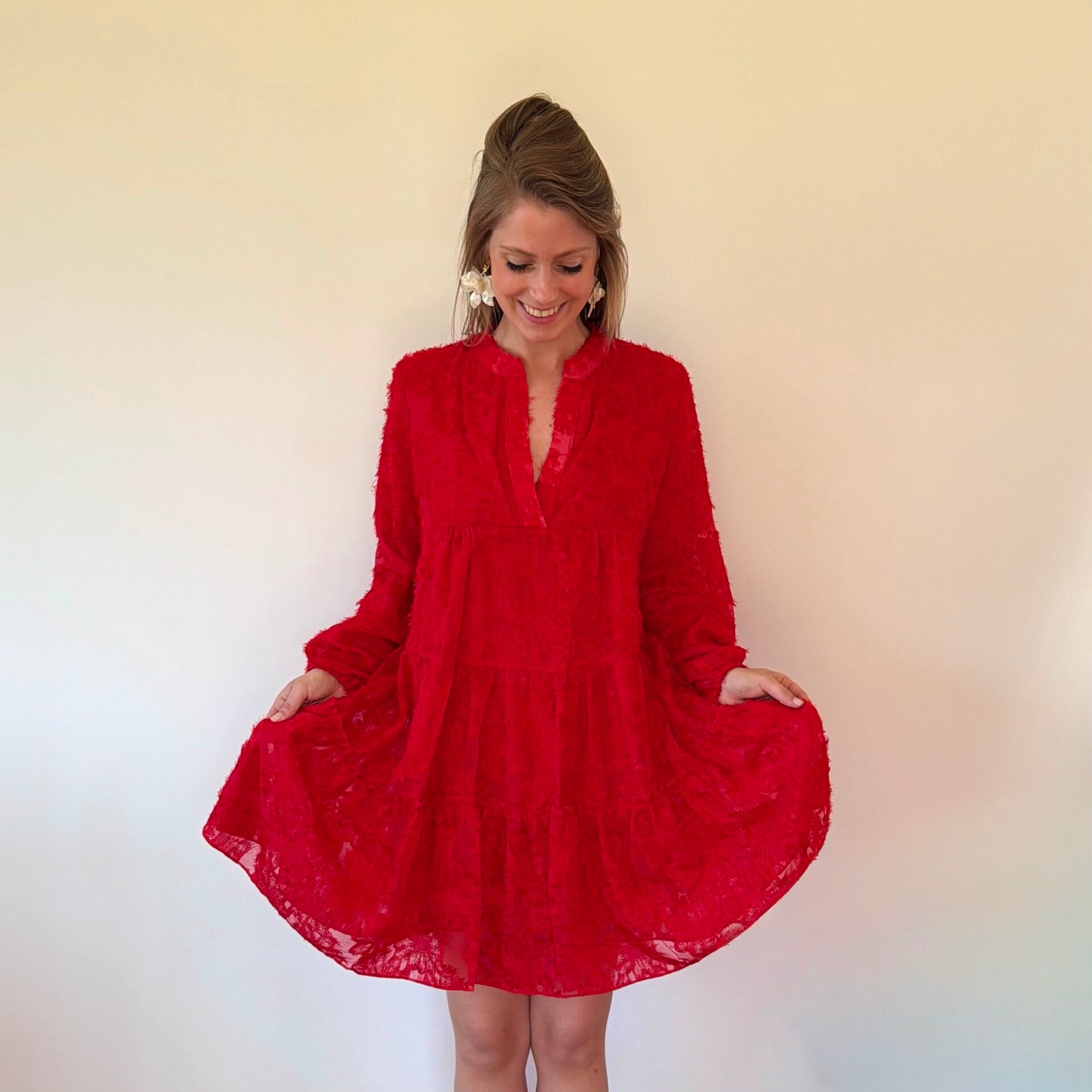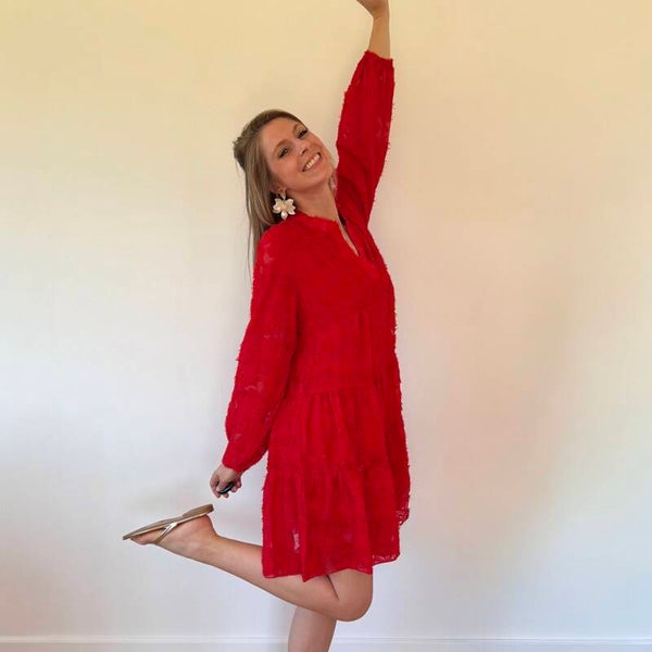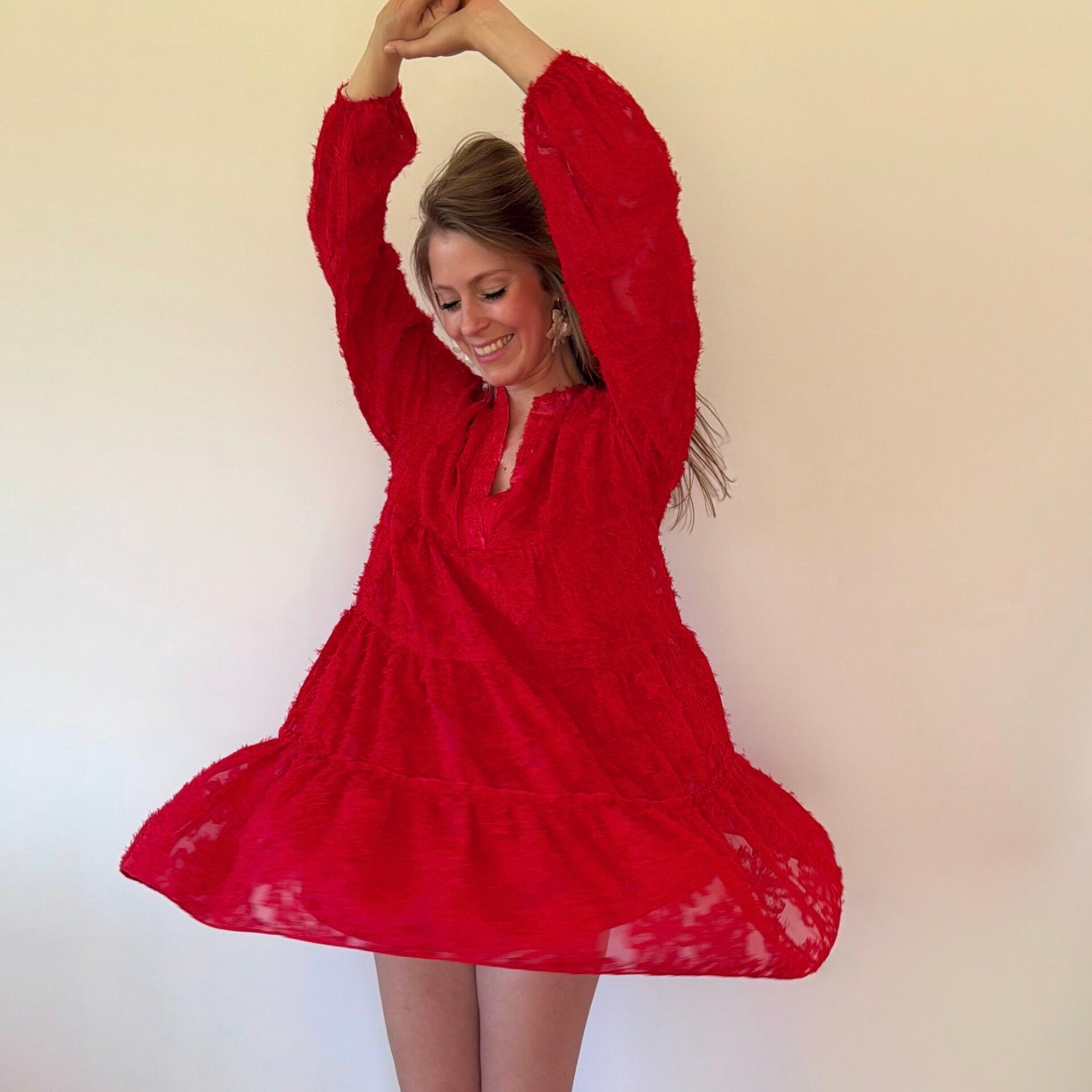 Een fleurig roodkleurig kleedje die bestaat uit verschillende lagen waardoor het zwierig valt met een leuk motiefje die het kleedje net dat beetje extra geeft.