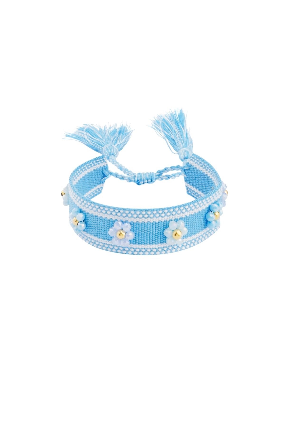 Een mooi stoffen armbandje, afgewerkt met mooie bloemenkraaltjes en door de touwtjes makkelijk aanpasbaar naar eigen wens.